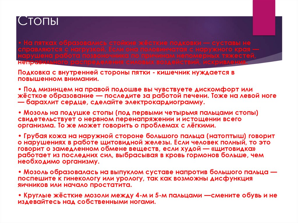 • Круглые жёсткие мозоли между 4-м и 5-м пальцами —смените обувь и не