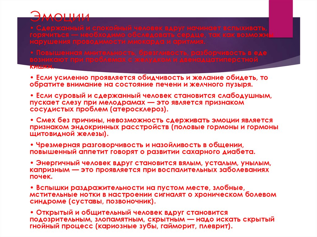 Эмоции• Сдержанный и спокойный человек вдруг начинает вспыхивать,