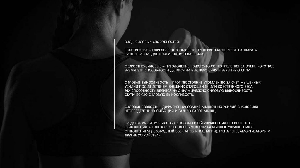 ВИДЫ СИЛОВЫХ СПОСОБНОСТЕЙ:СОБСТВЕННЫЕ – ОПРЕДЕЛЯЮТ ВОЗМОЖНОСТИ НЕРВНО-МЫШЕЧНОГО АППАРАТА.