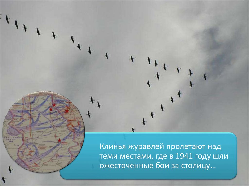 Клинья журавлей пролетают надтеми местами, где в 1941 году шли