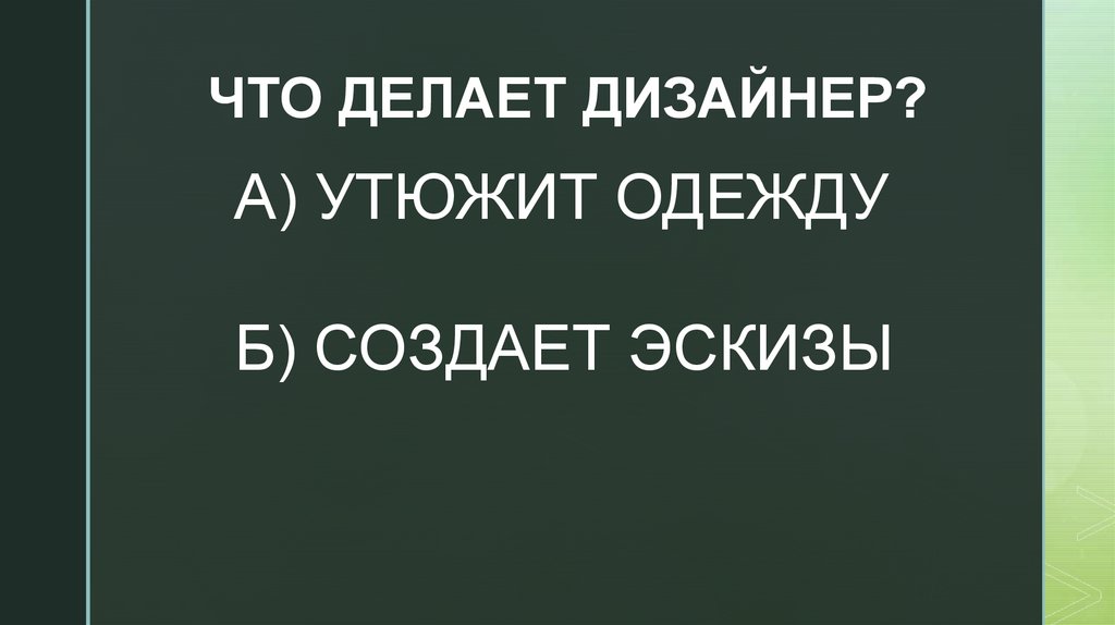 ЧТО ДЕЛАЕТ ДИЗАЙНЕР?А) УТЮЖИТ ОДЕЖДУ