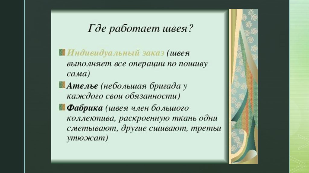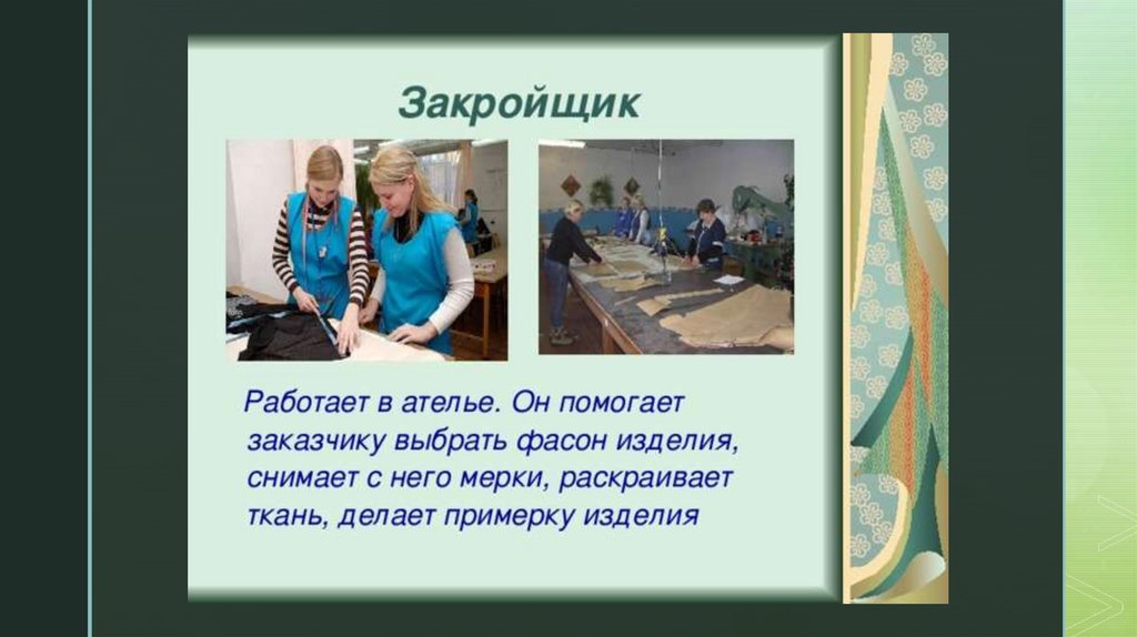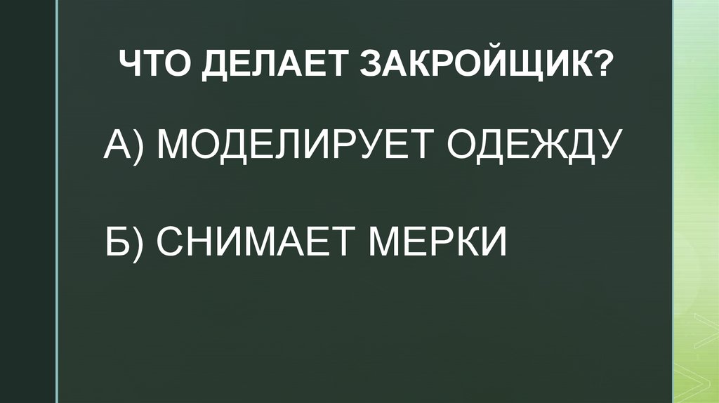 ЧТО ДЕЛАЕТ ЗАКРОЙЩИК?А) МОДЕЛИРУЕТ ОДЕЖДУ
