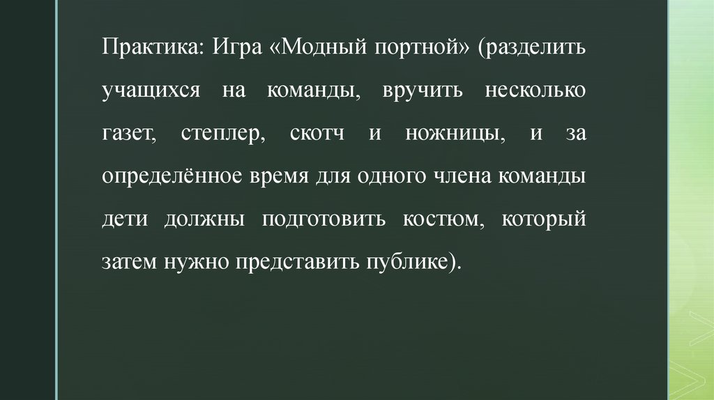 Практика: Игра «Модный портной» (разделитьучащихся на команды, вручить несколько