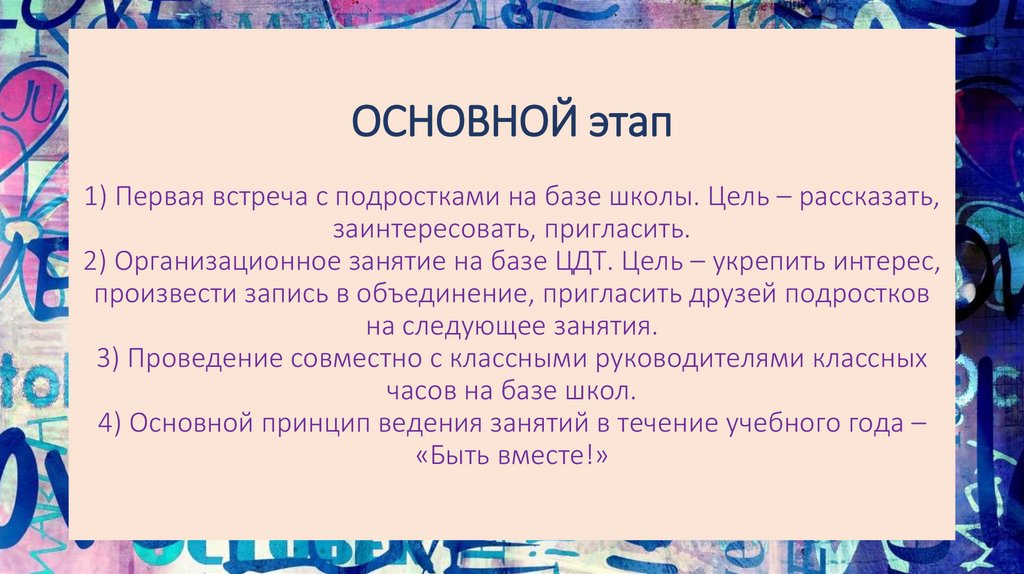 ОСНОВНОЙ этап1) Первая встреча с подростками на базе школы. Цель – рассказать,