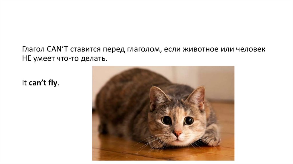 Глагол CAN’T ставится перед глаголом, если животное или человекНЕ умеет что-то делать.