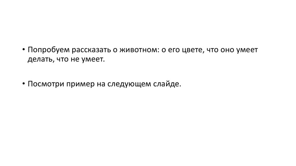 • Попробуем рассказать о животном: о его цвете, что оно умеетделать, что не умеет.