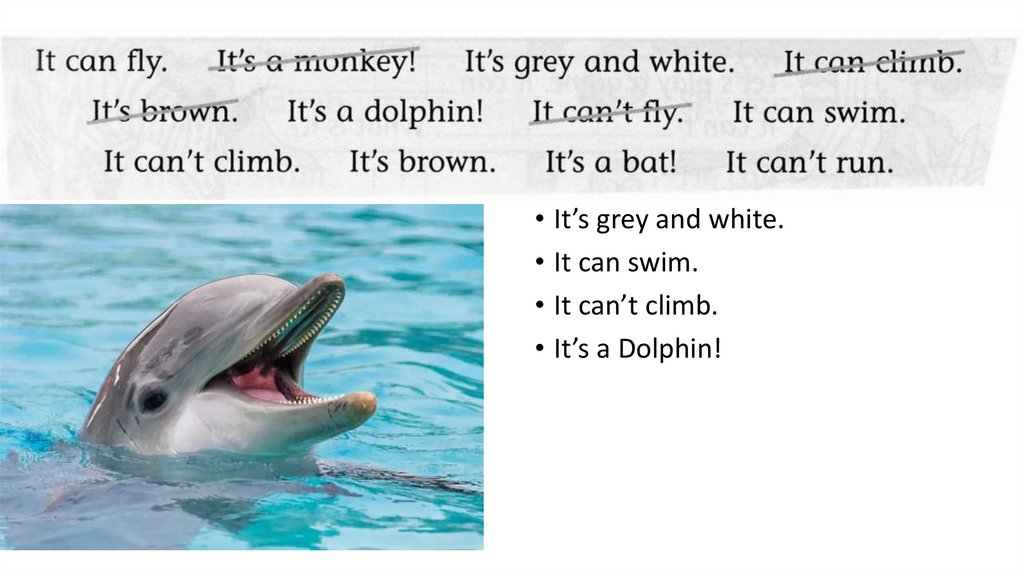 • It’s grey and white.• It can swim.