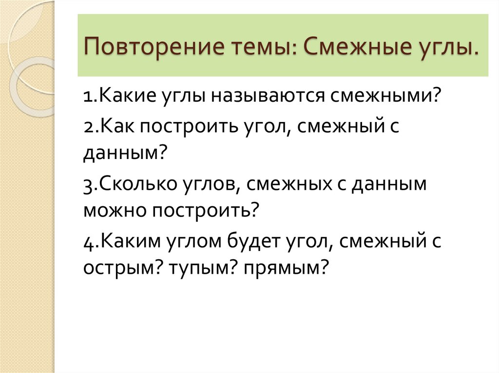 Повторение темы: Смежные углы.1.Какие углы называются смежными?