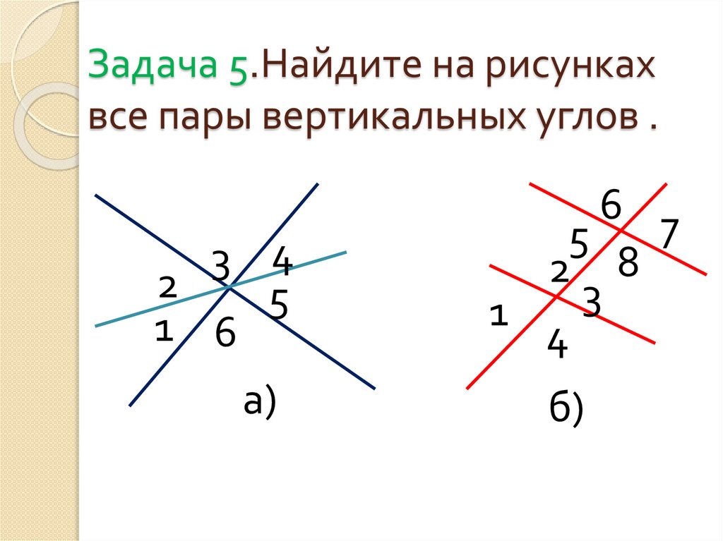 Задача 5.Найдите на рисункахвсе пары вертикальных углов .