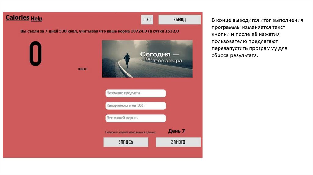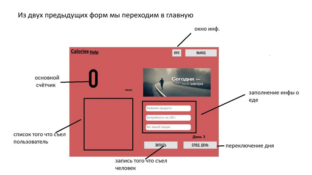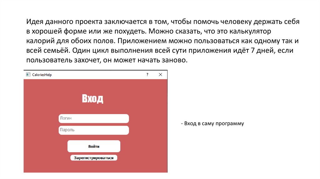 Идея данного проекта заключается в том, чтобы помочь человеку держать себяв хорошей форме или же похудеть. Можно сказать, что это калькулятор