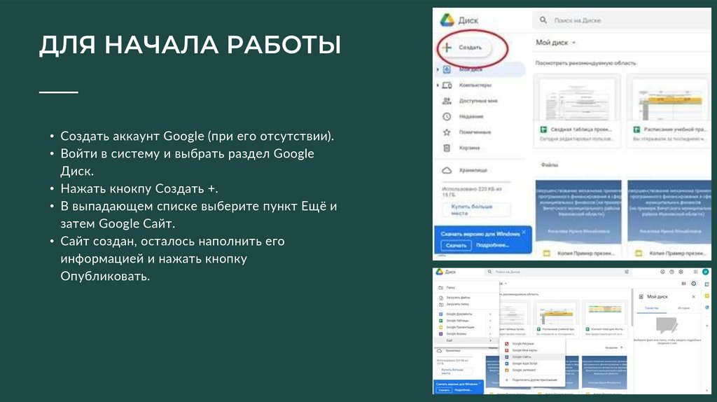 ДЛЯ НАЧАЛА РАБОТЫ• Создать аккаунт Google (при его отсутствии).