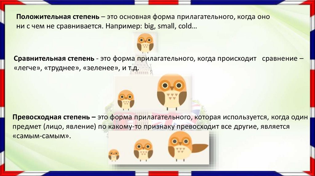 Положительная степень – это основная форма прилагательного, когда онони с чем не сравнивается. Например: big, small, cold…