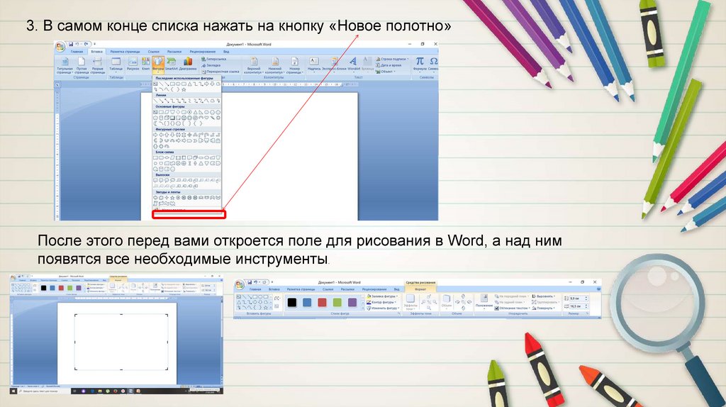 3. В самом конце списка нажать на кнопку «Новое полотно»После этого перед вами откроется поле для рисования в Word, а над ним