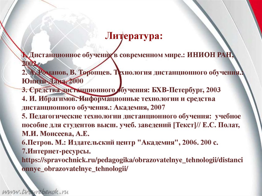 Литература:1. Дистанционное обучение в современном мире.: ИНИОН РАН,