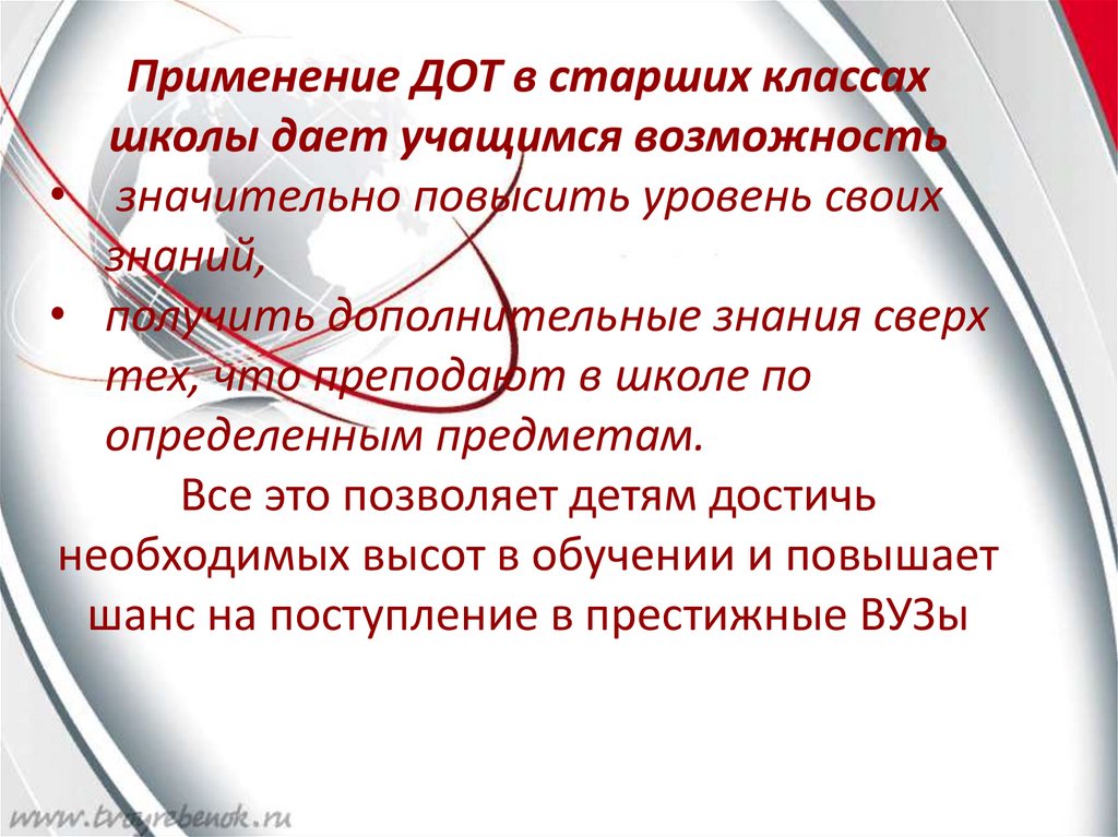 Применение ДОТ в старших классахшколы дает учащимся возможность