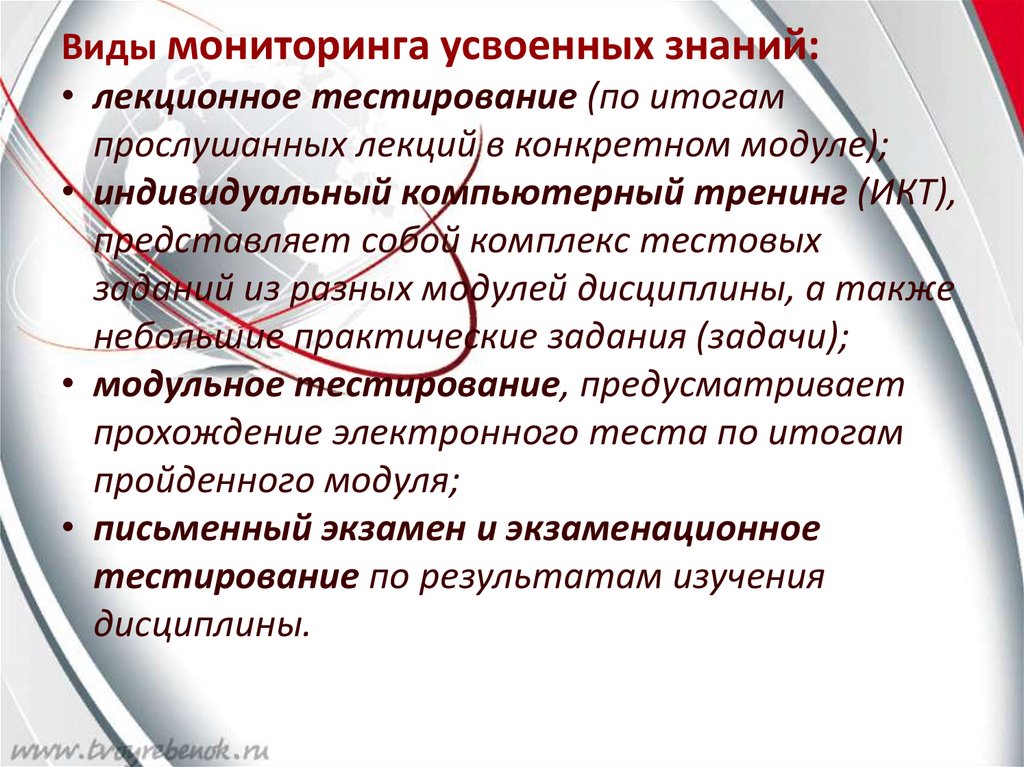 Виды мониторинга усвоенных знаний:• лекционное тестирование (по итогам