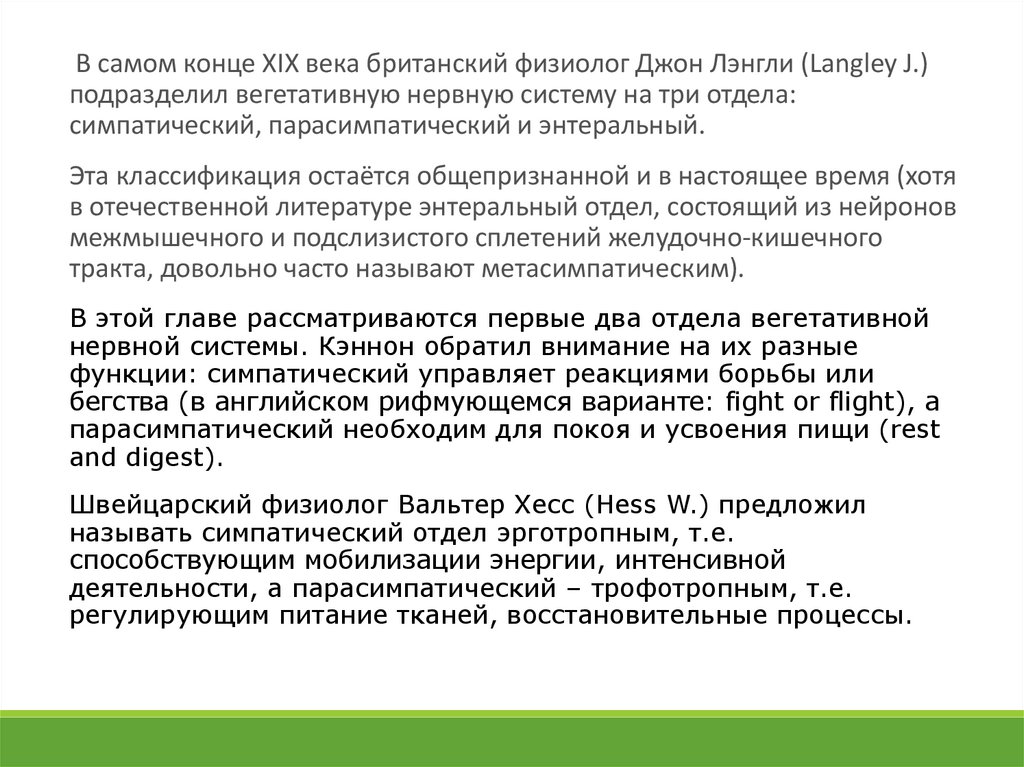 В самом конце XIX века британский физиолог Джон Лэнгли (Langley J.)подразделил вегетативную нервную систему на три отдела: