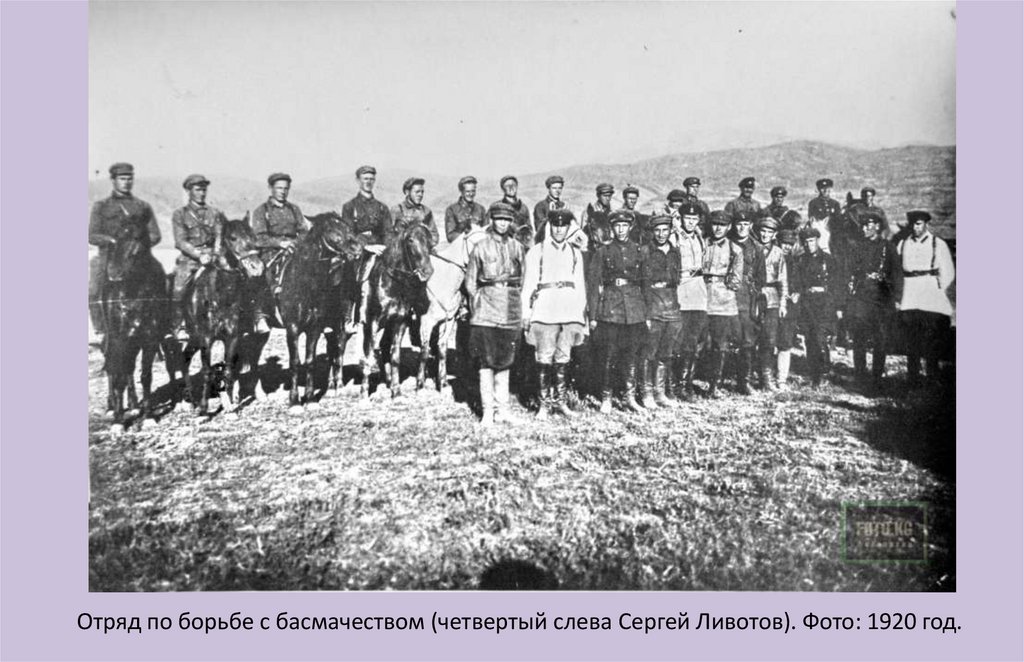 Отряд по борьбе с басмачеством (четвертый слева Сергей Ливотов). Фото: 1920 год.4.