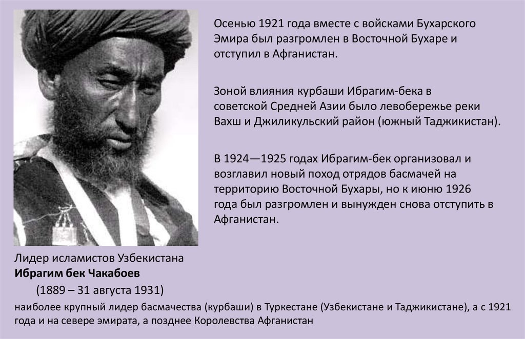 наиболее крупный лидер басмачества (курбаши) в Туркестане (Узбекистане и Таджикистане), а с 1921