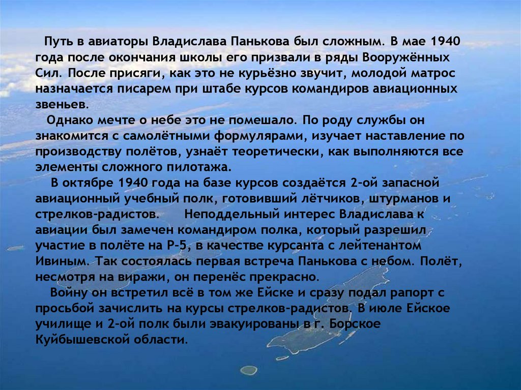 Путь в авиаторы Владислава Панькова был сложным. В мае 1940года после окончания школы его призвали в ряды Вооружённых