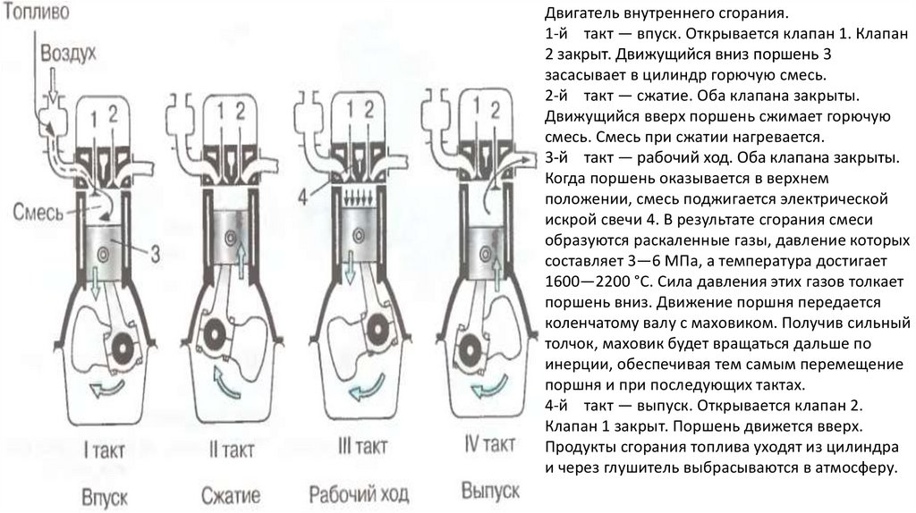 Двигатель внутреннего сгорания.1-й такт — впуск. Открывается клапан 1. Клапан