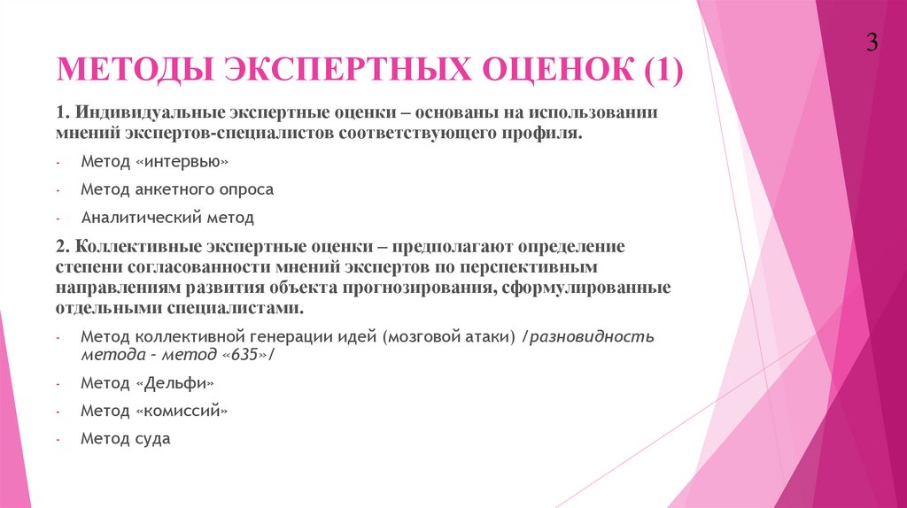 МЕТОДЫ ЭКСПЕРТНЫХ ОЦЕНОК (1)1. Индивидуальные экспертные оценки – основаны на использовании
