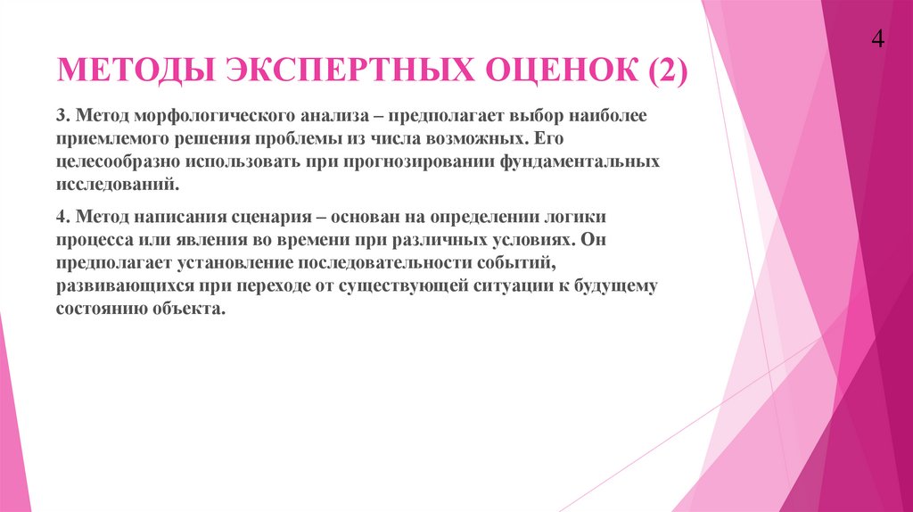 МЕТОДЫ ЭКСПЕРТНЫХ ОЦЕНОК (2)3. Метод морфологического анализа – предполагает выбор наиболее