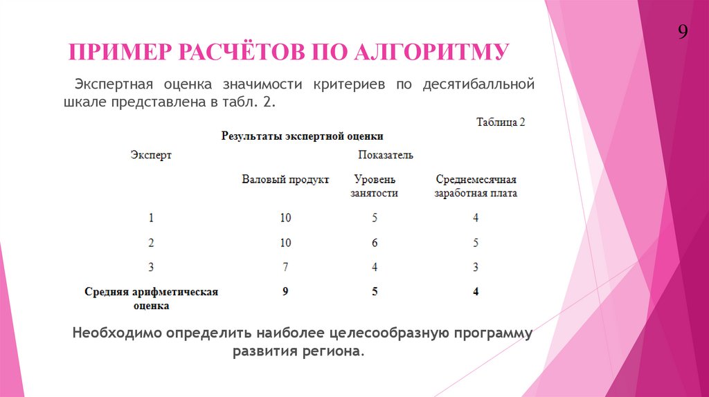 ПРИМЕР РАСЧЁТОВ ПО АЛГОРИТМУЭкспертная оценка значимости критериев по десятибалльной
