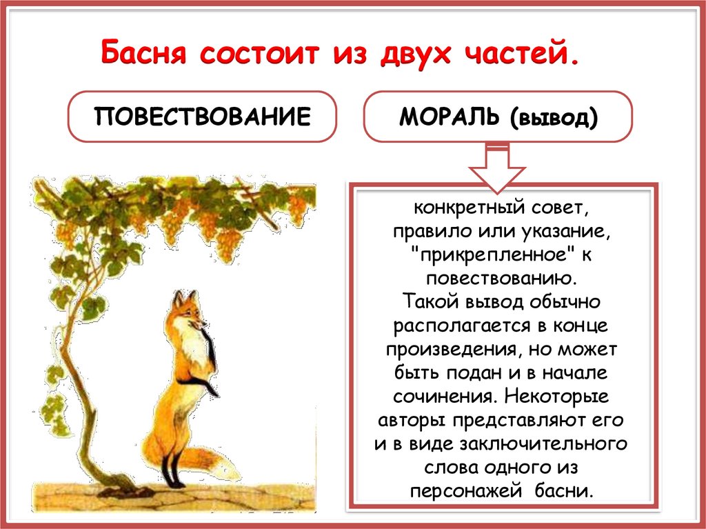 Басня состоит из двух частей.ПОВЕСТВОВАНИЕ