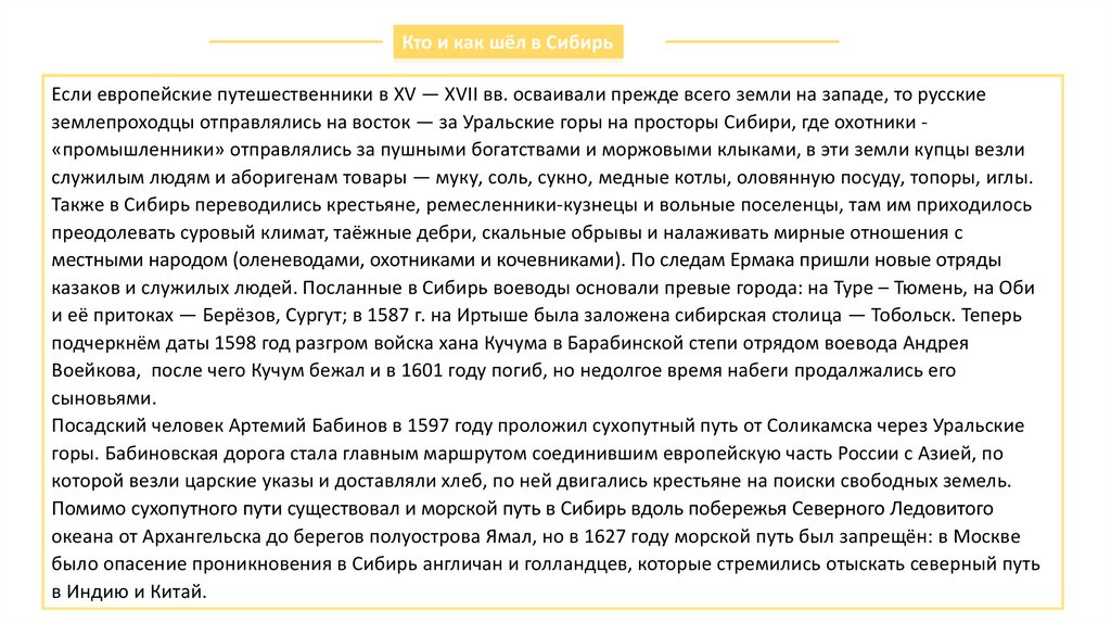 Кто и как шёл в СибирьЕсли европейские путешественники в XV — XVII вв. осваивали прежде всего земли на западе, то русские
