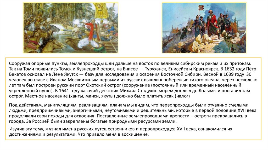 Изучив эту тему, я узнал имена русских путешественников и первопроходцев XVII века, ознакомился их