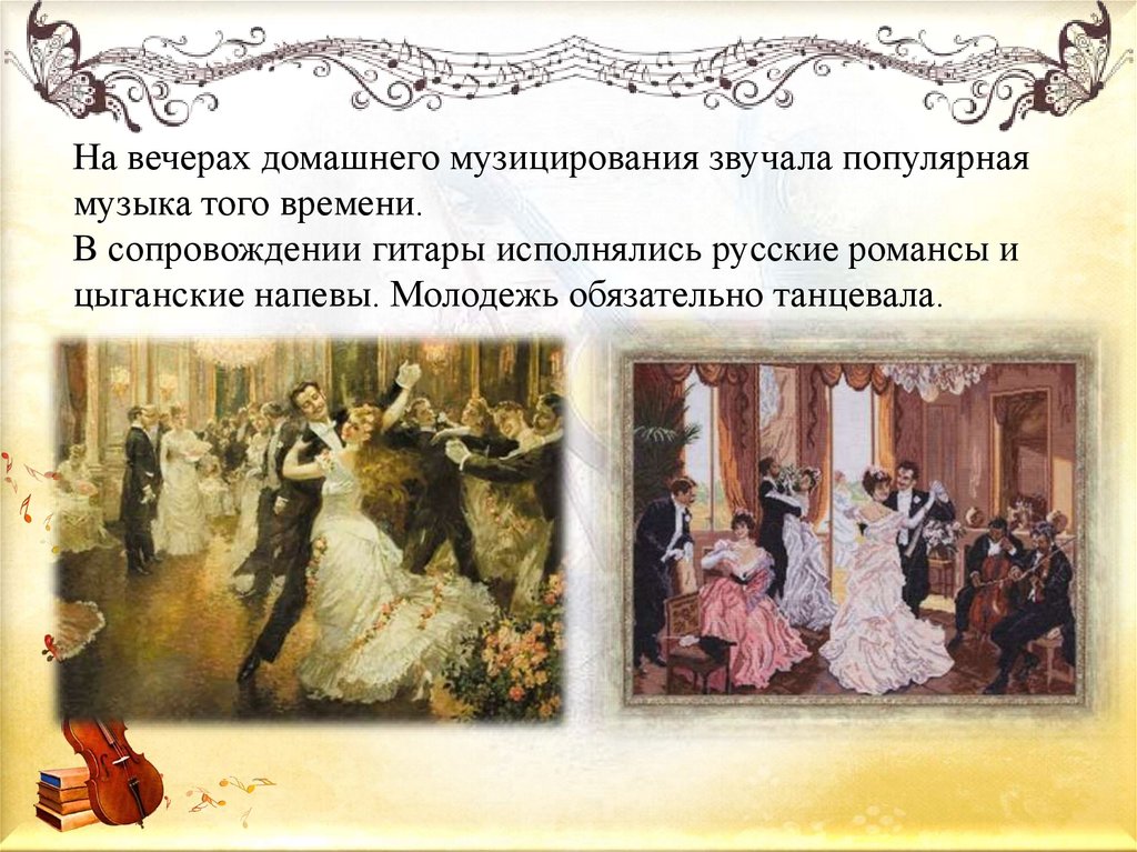 На вечерах домашнего музицирования звучала популярнаямузыка того времени.