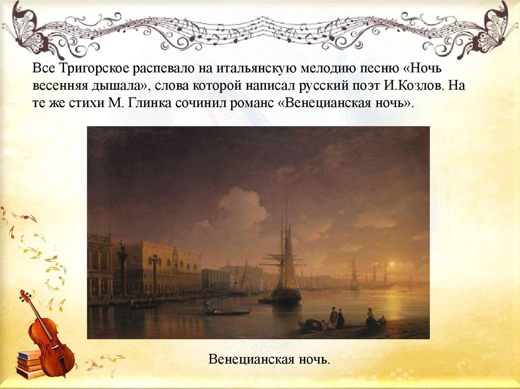 Все Тригорское распевало на итальянскую мелодию песню «Ночьвесенняя дышала», слова которой написал русский поэт И.Козлов. На