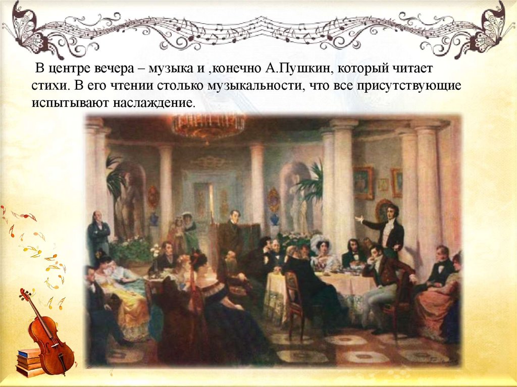 В центре вечера – музыка и ,конечно А.Пушкин, который читаетстихи. В его чтении столько музыкальности, что все присутствующие