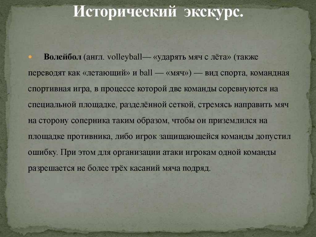 Волейбол (англ. volleyball— «ударять мяч с лёта» (такжепереводят как «летающий» и ball — «мяч») — вид спорта, командная