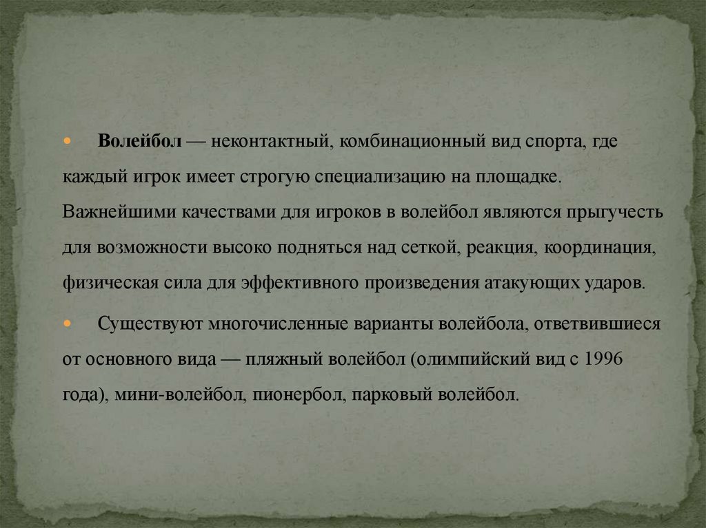 Волейбол — неконтактный, комбинационный вид спорта, гдекаждый игрок имеет строгую специализацию на площадке.