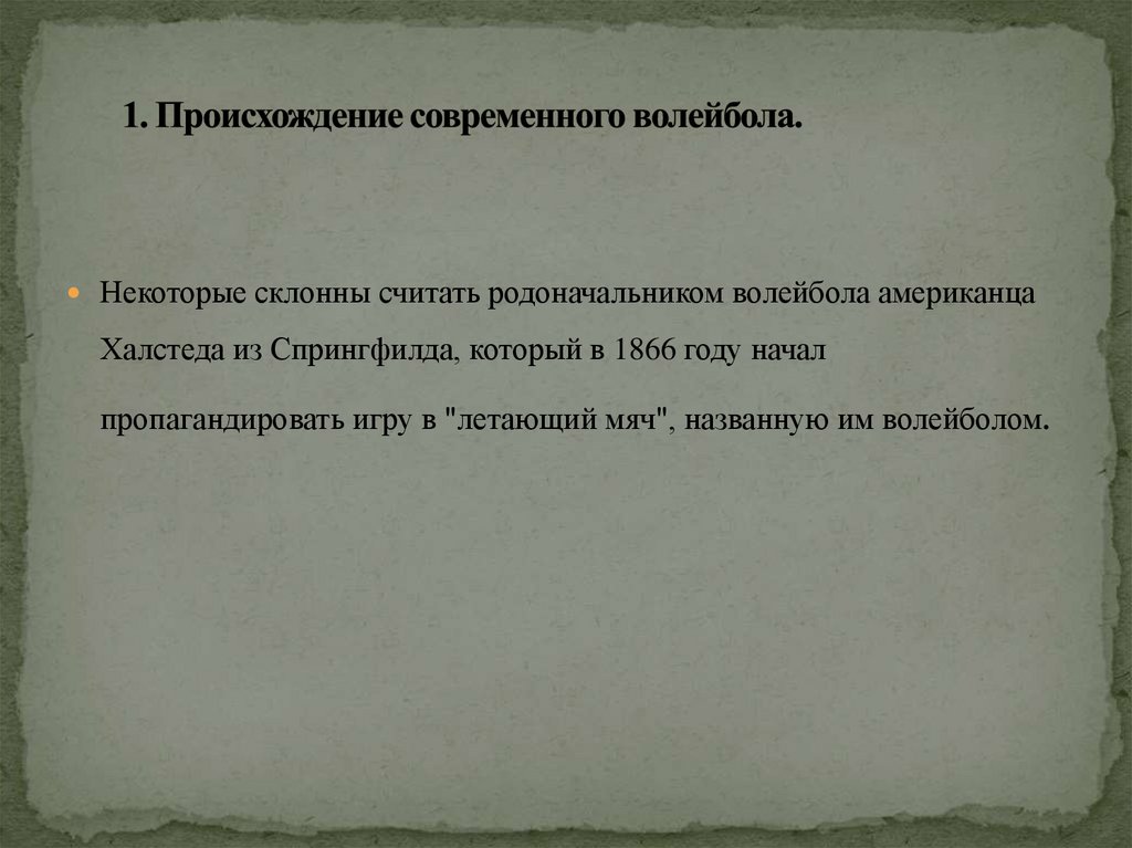 Некоторые склонны считать родоначальником волейбола американцаХалстеда из Спрингфилда, который в 1866 году начал