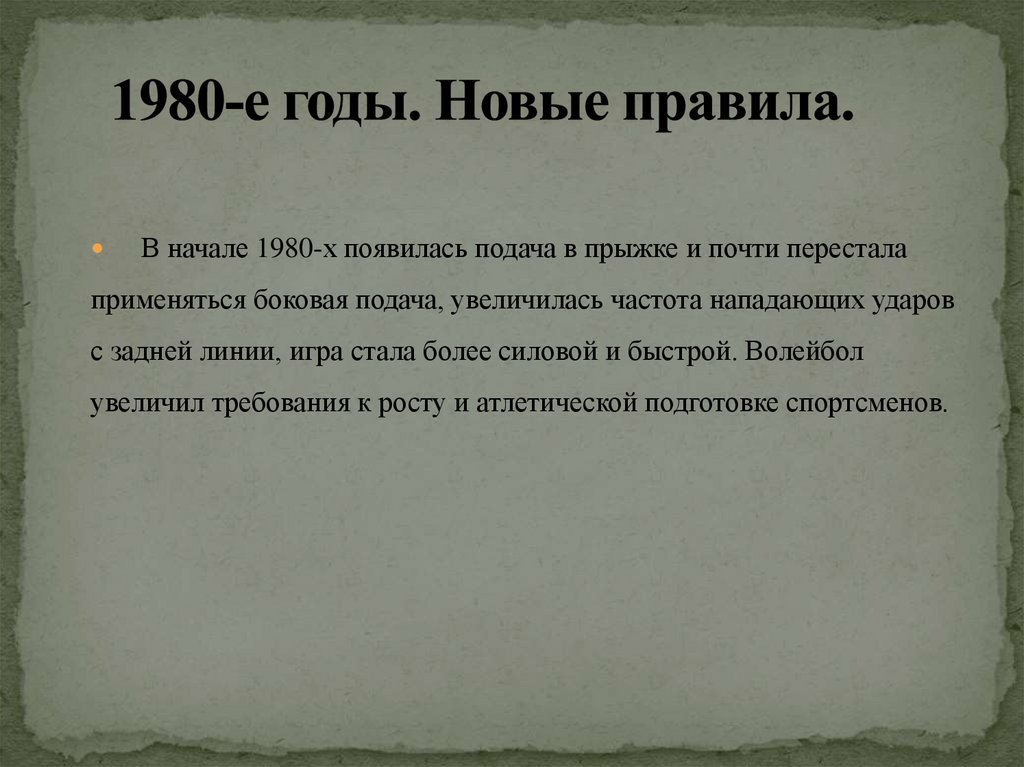 В начале 1980-х появилась подача в прыжке и почти пересталаприменяться боковая подача, увеличилась частота нападающих ударов