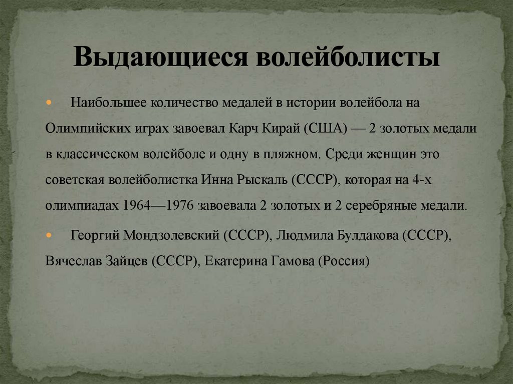Наибольшее количество медалей в истории волейбола наОлимпийских играх завоевал Карч Кирай (США) — 2 золотых медали