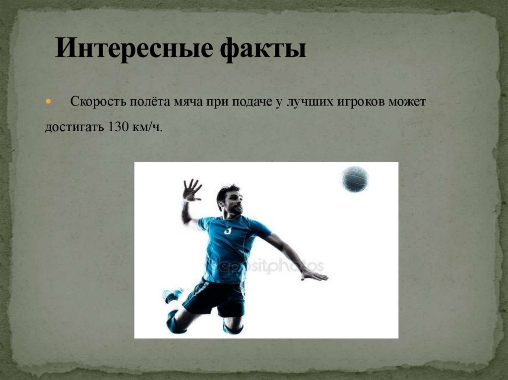 Скорость полёта мяча при подаче у лучших игроков можетдостигать 130 км/ч.