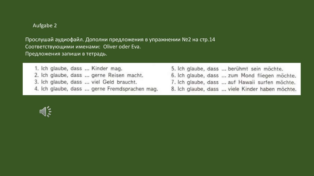 Aufgabe 2Прослушай аудиофайл. Дополни предложения в упражнении №2 на стр.14