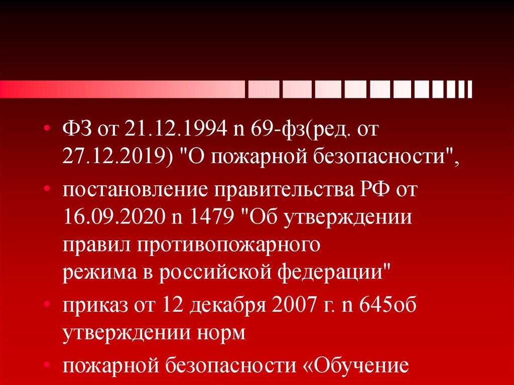 • ФЗ от 21.12.1994 n 69-фз(ред. от27.12.2019) "О пожарной безопасности",