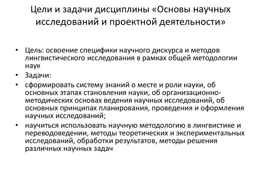 Цели и задачи дисциплины «Основы научныхисследований и проектной деятельности»