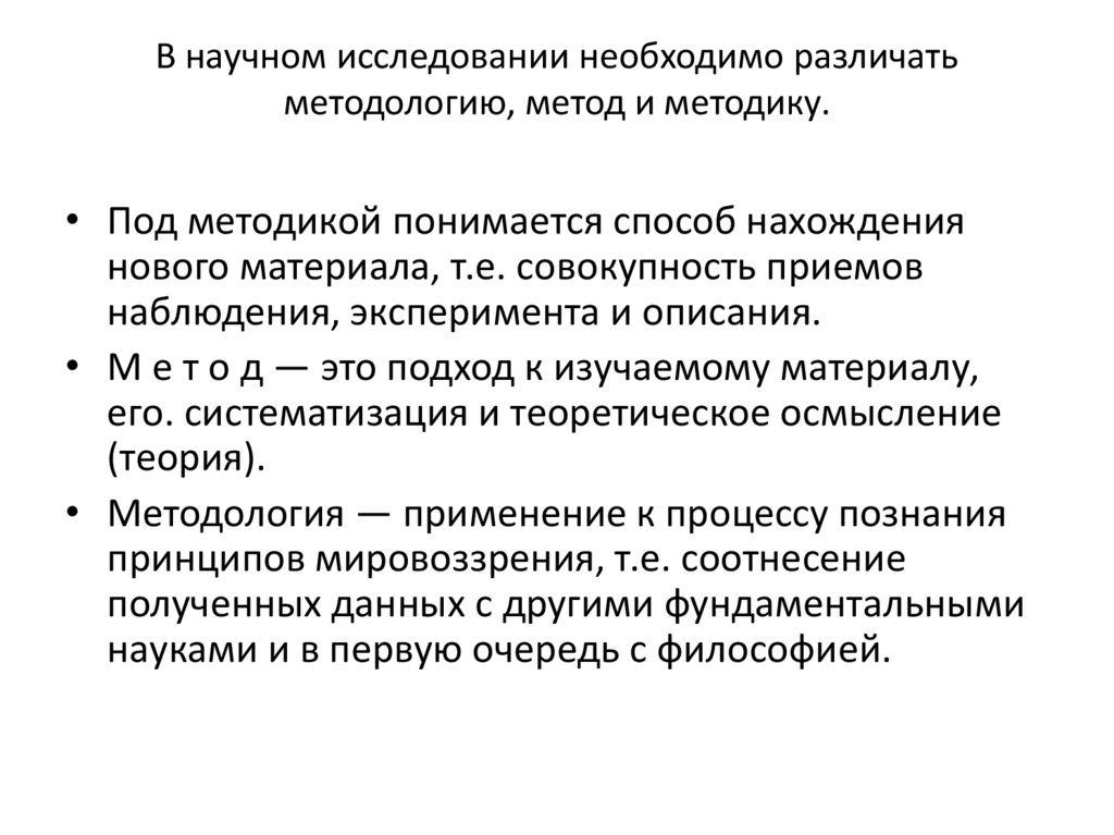 В научном исследовании необходимо различатьметодологию, метод и методику.