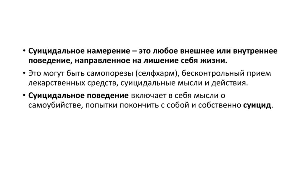 • Суицидальное намерение – это любое внешнее или внутреннееповедение, направленное на лишение себя жизни.