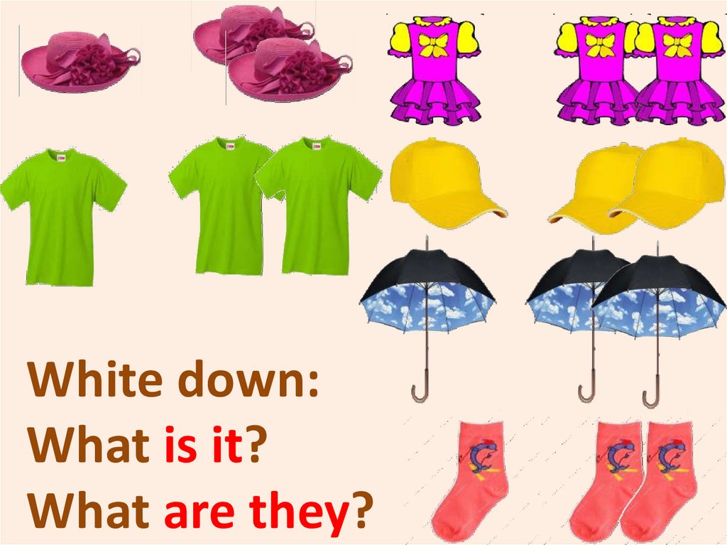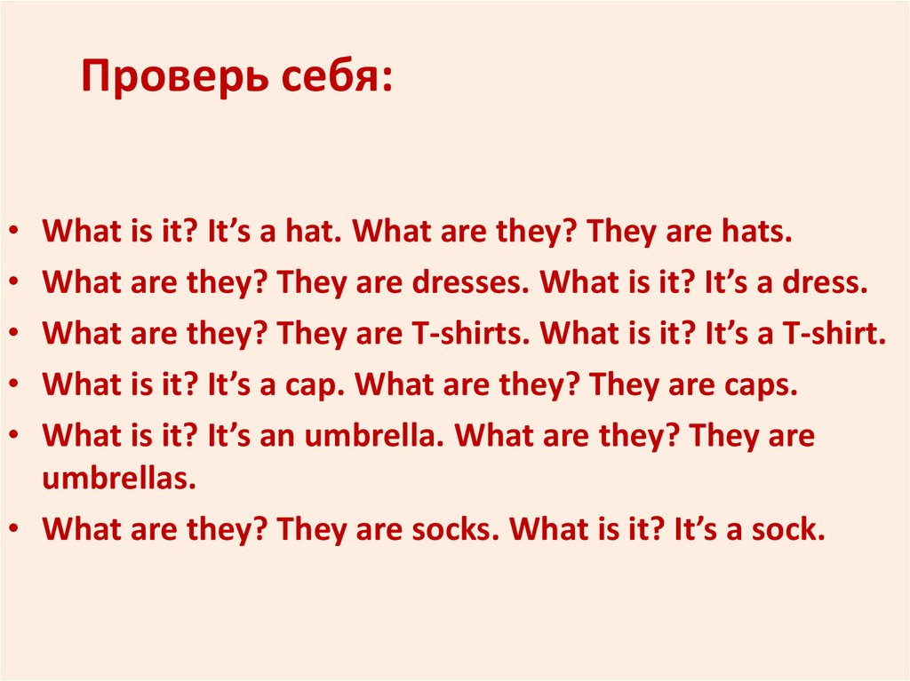 Проверь себя:What is it? It’s a hat. What are they? They are hats.