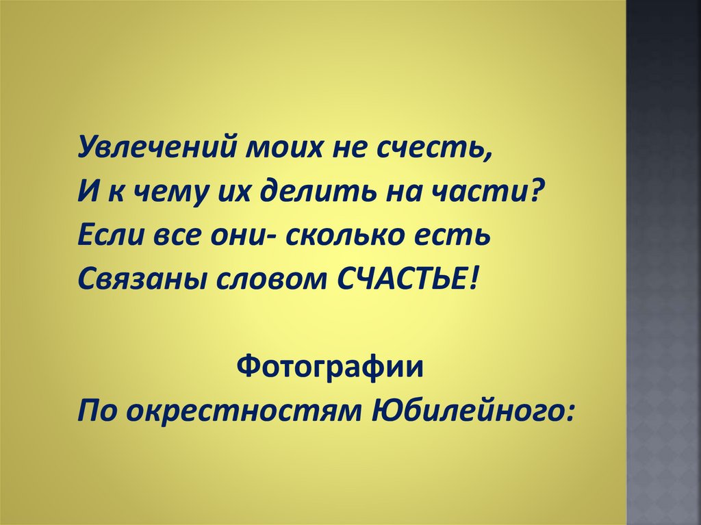 Увлечений моих не счесть,И к чему их делить на части?
