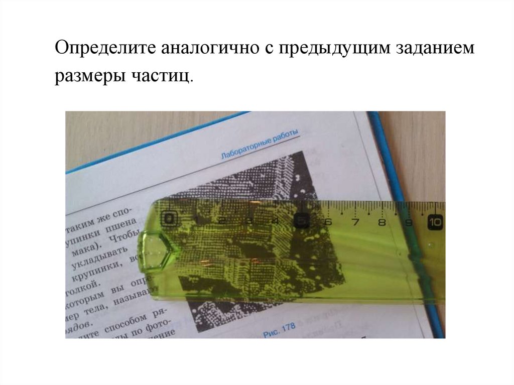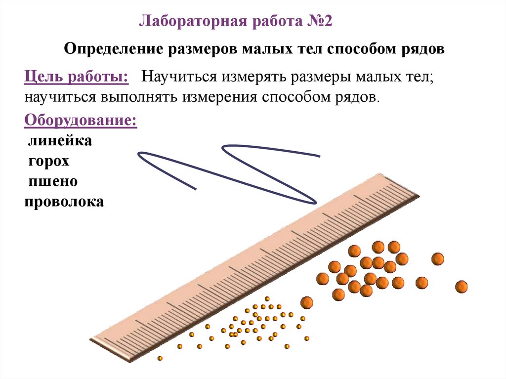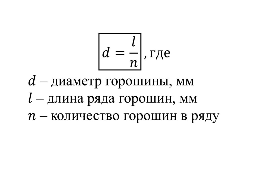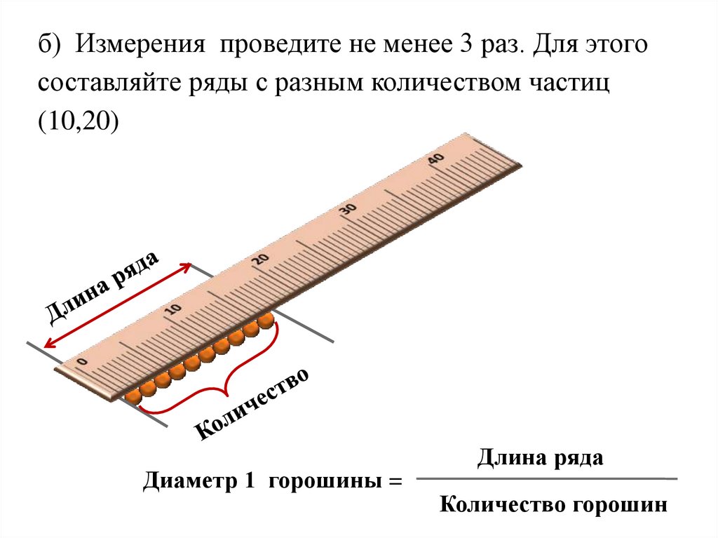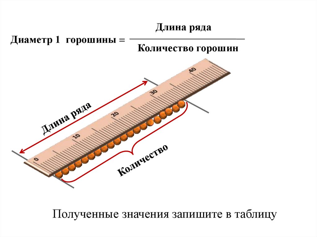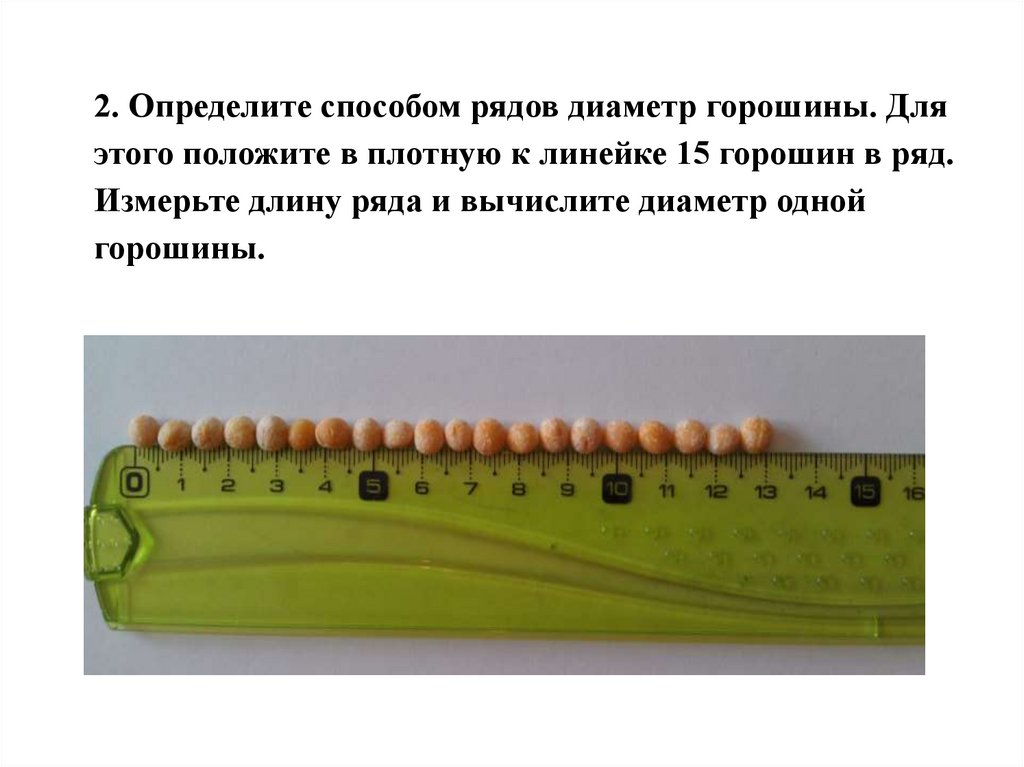2. Определите способом рядов диаметр горошины. Дляэтого положите в плотную к линейке 15 горошин в ряд.