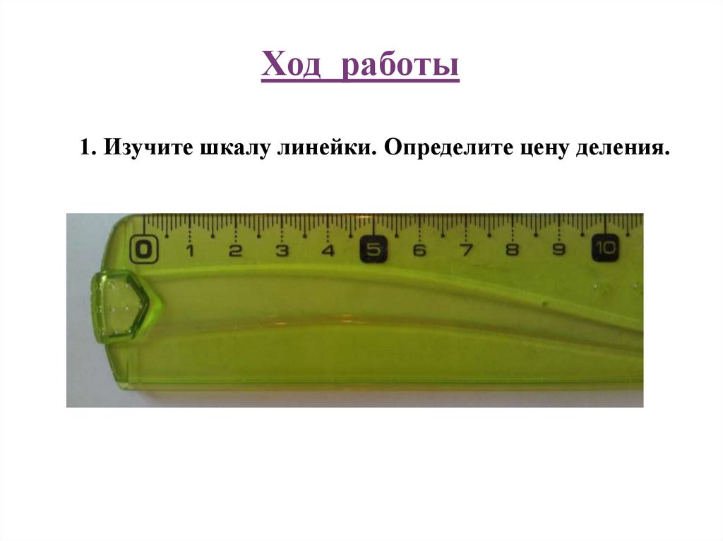 Ход работы1. Изучите шкалу линейки. Определите цену деления.