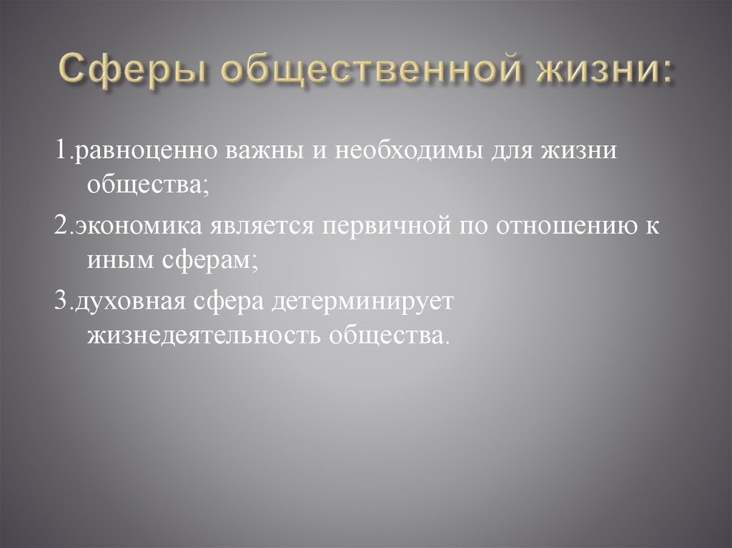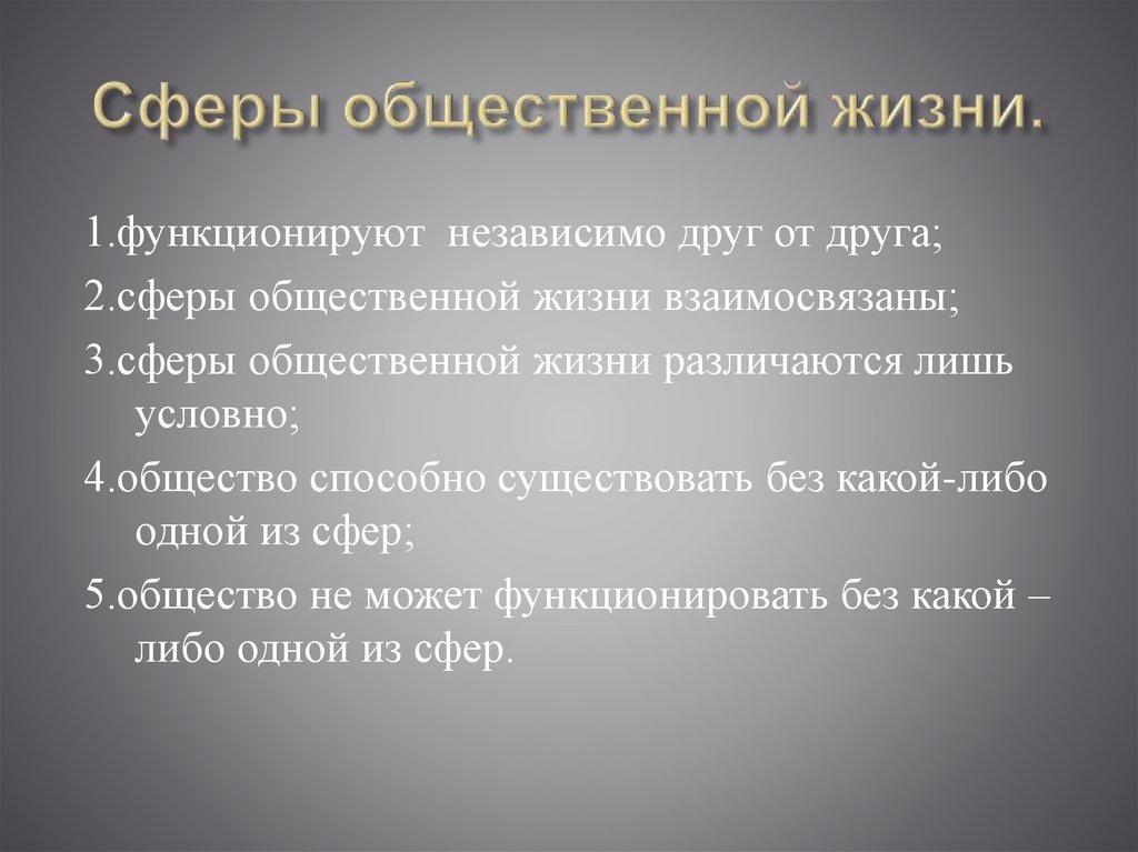 1.функционируют независимо друг от друга;2.сферы общественной жизни взаимосвязаны;